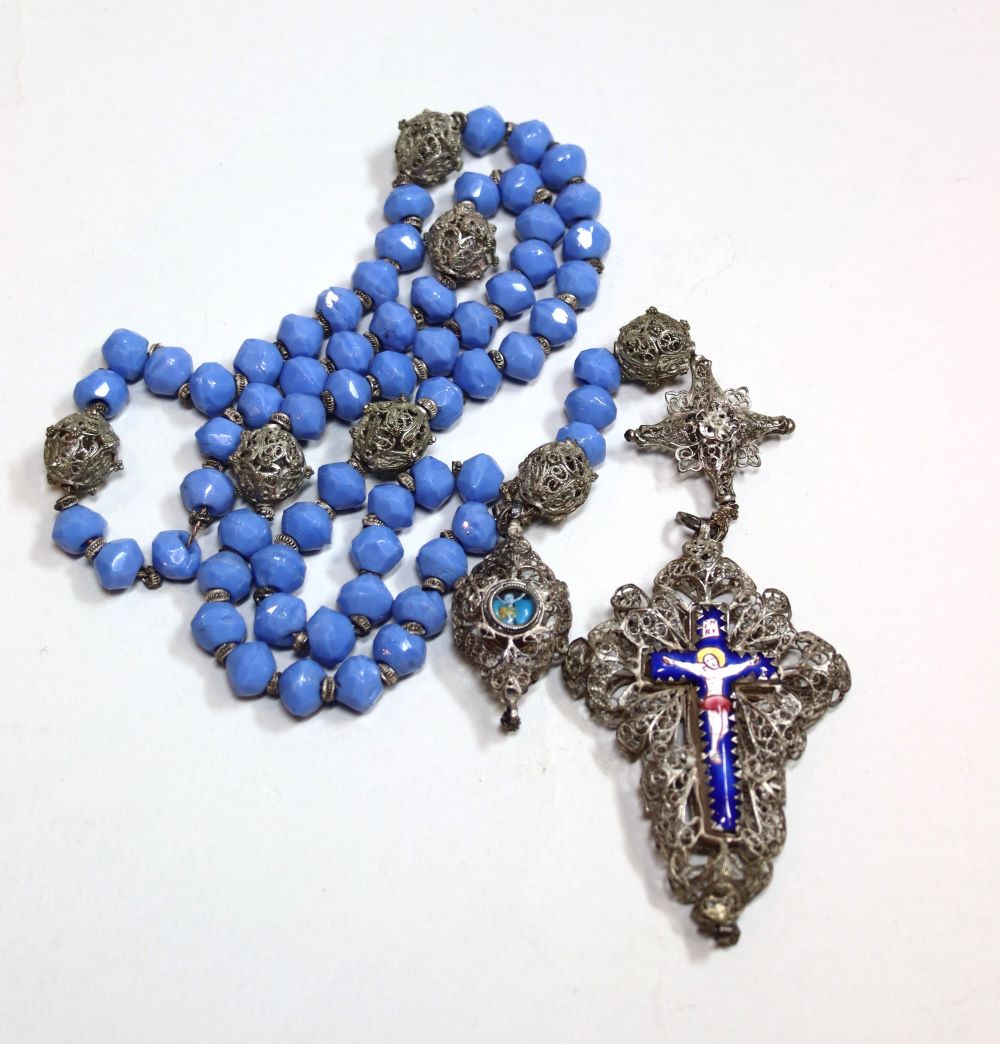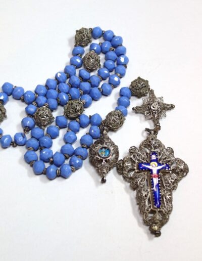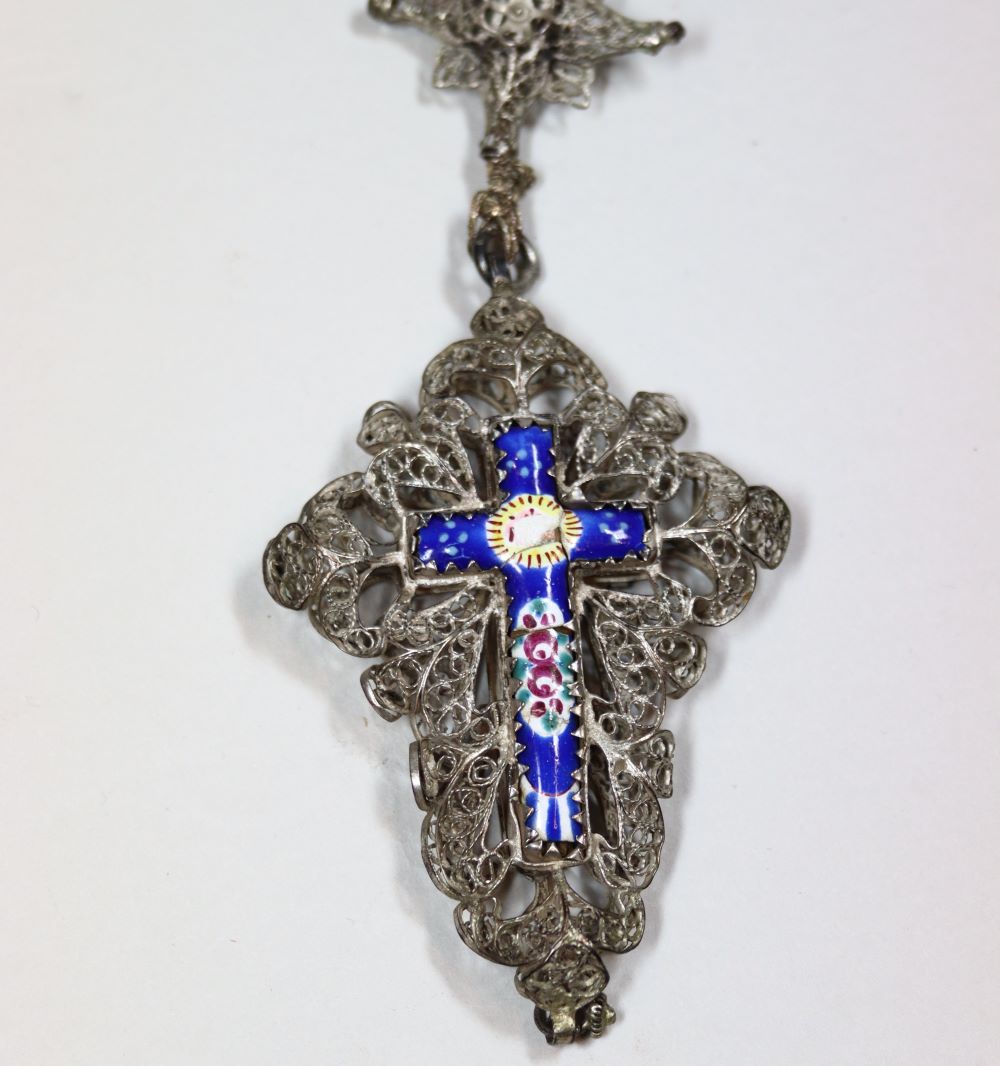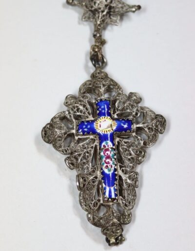Rosenkranz KurzbeschreibungRosenkranz, Silberkreuz mit Emailechristus und farbigen Glasperlen HerkunftSchwäbisch Gmünd DatierungUm 1850 ZustandGuter Zustand MaßeLänge: 52 cm Kreuz 8 cm Artikel-Nummer8520 Preis€ 365.- ← Großes Votivbild Heiliger Andreas →