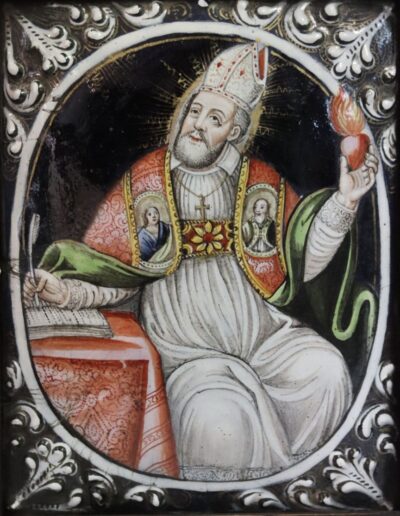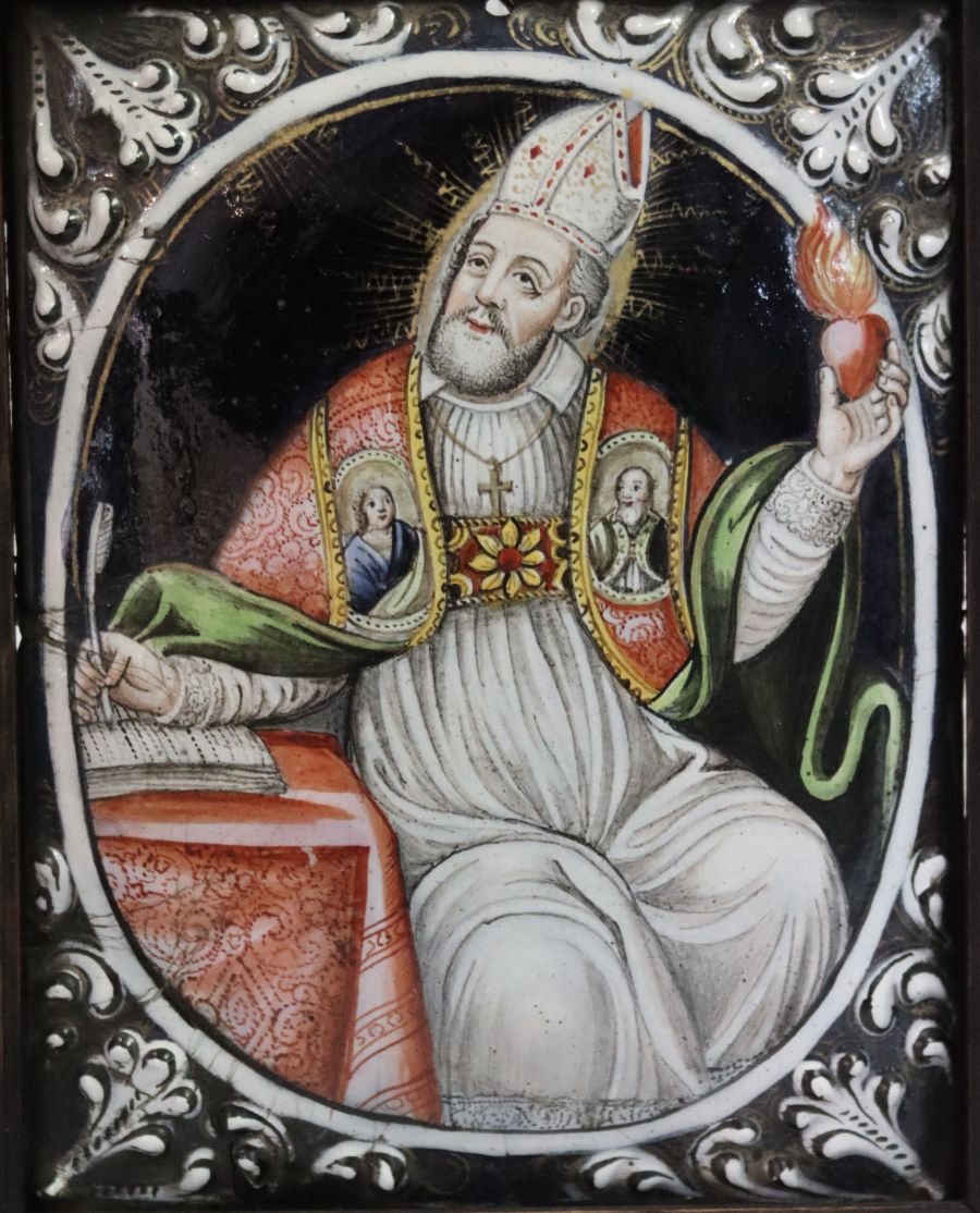 Limoges Emailleplakette KurzbeschreibungKupfer-Emailleplakette aus Limoges, mit der Darstellung des Heiligen Augustinus HerkunftLimoges / Frankreich DatierungUm 1700 ZustandGuter Zustand Maße15 cm x 12 cm Artikel-Nummer4693 Preis€ 1750.- ← Votivbild mit Soldat